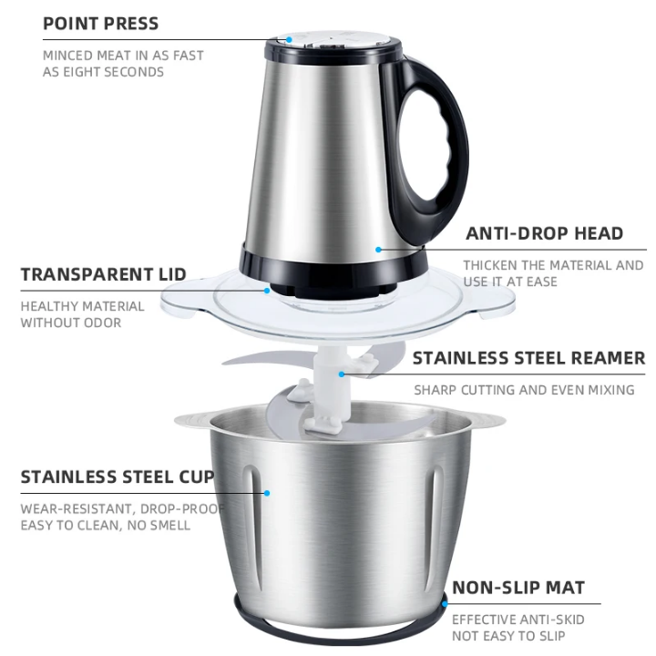 This multifunctional kitchen food chopper is designed for efficiency and versatility, featuring automatic operation, variable speed control, and a pure copper motor. It supports multiple functions such as chopping, mixing, grinding, and slicing with low noise.